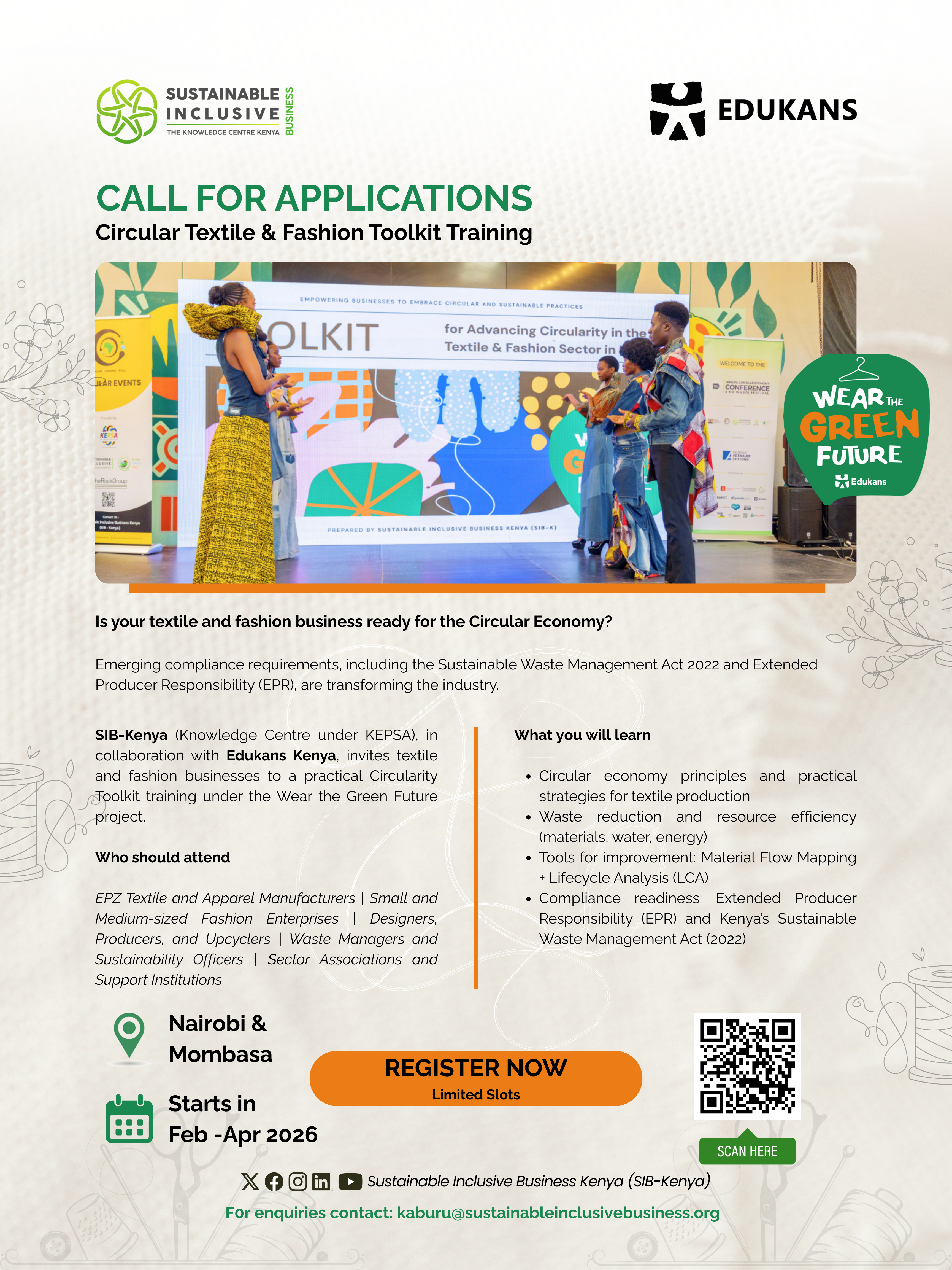 Between January and March 2026, we will offer training to companies in Nairobi and in Mombasa drawn from EPZs and SMEs working across the textile and fashion value chain.